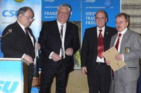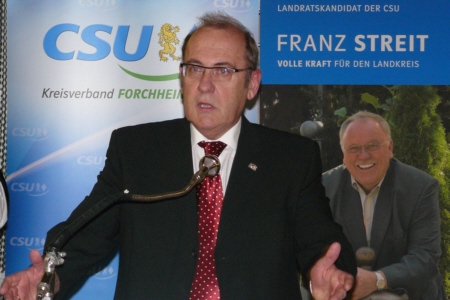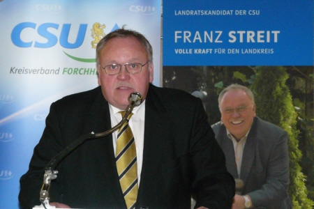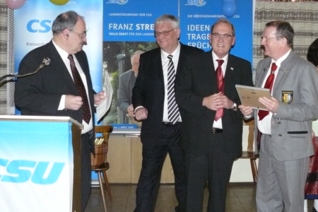 Eduard Nöth (MdL),  Peter Eismann (MdL), Landratskandidat Franz Streit, 1. Bürgermeister Willi Müller, Ortsvorsitzender Heinz Egloffstein, Ewald Mayer, Bernd Schmid, Dr. Karl Theodor zu Guttenberg (MdB)