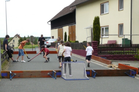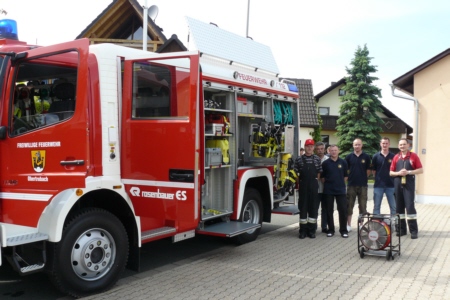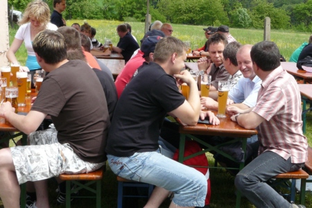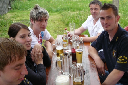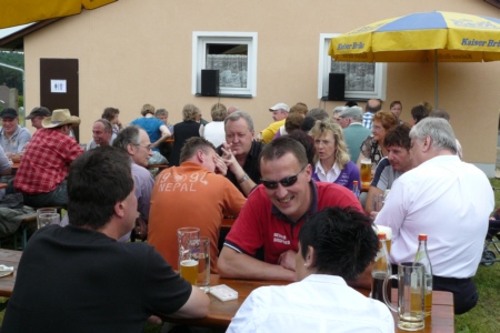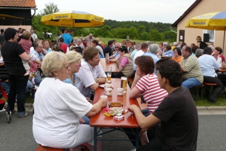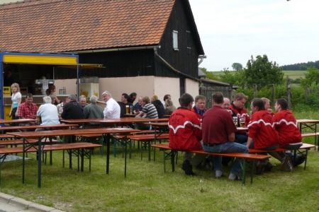 | Am 21. Mai 2009 hielt die FFW Geschwand bei anfangs sonnigen Wetter, einem kurzen Schauer um die Mittagszeit, einem sehr sonnigen Nachmittag und einen abkühlenden Schauer gegen Abend ihre traditionelle Grillparty am Feuerwehrhaus ab. Die Veranstaltung begann mit einem Gottesdienst (an den auch die Fahnenabordnung der FFW teilnahm), anschließend trafen sich die Freunde der Feuerwehr bei Weißwürsten mit Brezen und Weißbier zum Frühschoppen. Zu Mittag gab es die weit über die Geschwander Grenzen hinaus bekannten gegrillten Schweinshaxen. Am Nachmittag gab es Kaffee und Kuchen, (der Erlös kam wie alle Jahre der Behindertengruppe zu Gute). Die Kameraden der FFW Obertrubach zeigten den Gästen ihr neues Löschfahrzeug LF 10/6. Danach wurde bis in die späten Abendstunden gefeiert. |