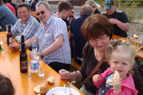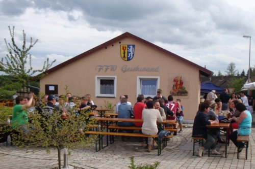 | Am 09. Mai 2013 hielt die FFW Geschwand am Feuerwehrhaus ihre traditionelle Grillparty ab. Bei anfänglich noch etwas kühlen Temperaturen jedoch im Tagesverlauf immer schöner werdenden Wetter mit frühsommerlichen Temperaturen war der Frühschoppen bei Weißwürsten mit Brezen und Weißbier schon bestens besucht. Viele benachbarte und befreundete Wehren waren sowohl zum Frühschoppen als auch am Nachmittag zu Gast bei der FFW Geschwand. Leider konnten aufgrund der zeitlichen Nähe zum Signalsteinfest die allseits geschätzten Grillhaxen nicht angeboten werden. Am Nachmittag servierte die Familie Steinhäußer Kaffee und Kuchen für die Besucher (der Erlös kam wie jedes Jahr der Behindertengruppe zu Gute). Danach wurde bis in die frühen Morgenstunden gefeiert. |