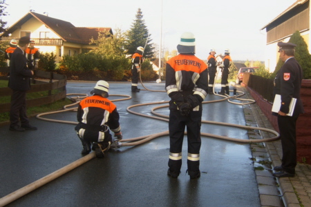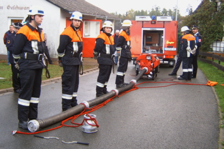 | Am 21. Oktober 2006 legten 14 Feuerwehrkameraden der FFW Geschwand in 5 Leistungsstufen mit Erfolg die Prüfung fürs Leistungsabzeichen ab. Unter den Augen der Schiedsrichter Reiner Disselberger (KBI) aus Neunkirchen, Wolfgang Baumann aus Walkersbrunn und unserem KBM Simon Hofmann aus Bieberbach legten die Kameraden eine hervorragende Prüfung ab. Eine so ordentliche, saubere, ruhige und materialschonende Leistung habe ich in diesem Jahr noch nicht gesehen, lobte KBI Reiner Disselberger die Prüflinge. Im Anschluss an die Abnahme wurde dann die erfolgreich abgelegte Prüfung mit den restlichen Aktiven Kameraden und den Ehrenmitgliedern gebührend gefeiert. |
