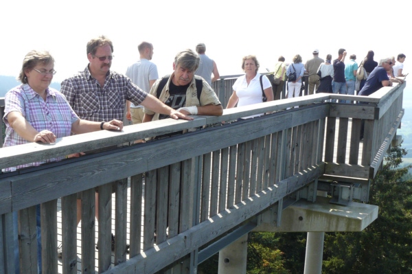 Die Ausflügler blicken vom Bogenberg auf die Donau