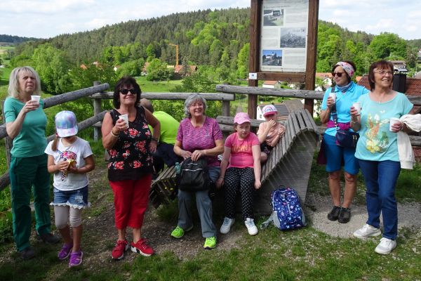 Die Wanderfreunde bei einer Rast vor dem Bärenturm in Bärnfels