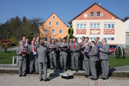 Gänsehaut mag den einen oder anderen schon befallen haben, als dann noch die wunderbaren Tenöre und Soli von Jörg Ebenhack und Bernhard Eckert kaum noch eine stimmungsvolle Steigerung zuließen. Der liebe Gott bedankte sich jedenfalls mit strahlendem Sonnenschein. Anschließend boten die Sänger das gleiche Repertoire an Liedern mit dem Lobpreis Gottes, der Natur, des Frühlings und der Heimat am monumentalen Osterbrunnen von Bieberbach. Ein zu Ostern kunstvoll gestalteter Ort, der allerdings sehr viel stärker vom Tourismus überlagert wird.