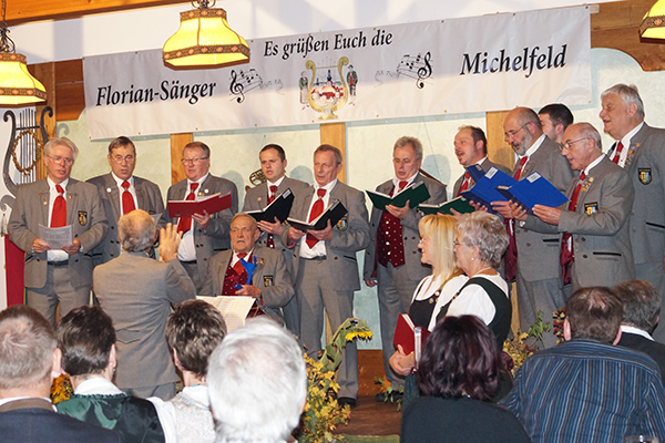 die Singruppe des FSV-Geschwand beim Volksmusikabend in Michelfeld auf. Weitere Teilnehmer waren die Florian-Sänger, die Egloffsteiner-Burgspatzen, die Friedrich-Moila und Hans Bauer und seine Musikanten.