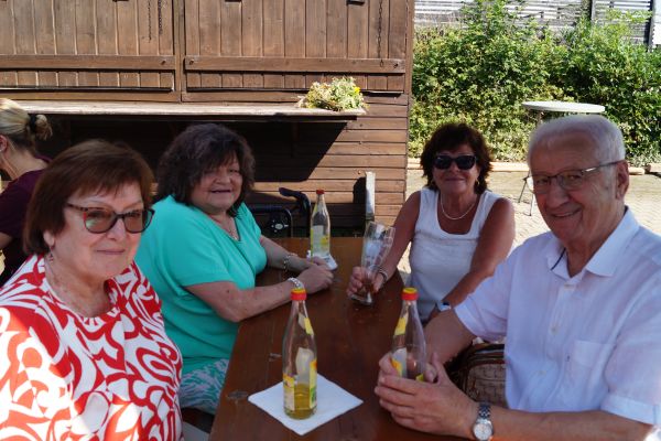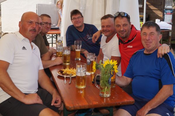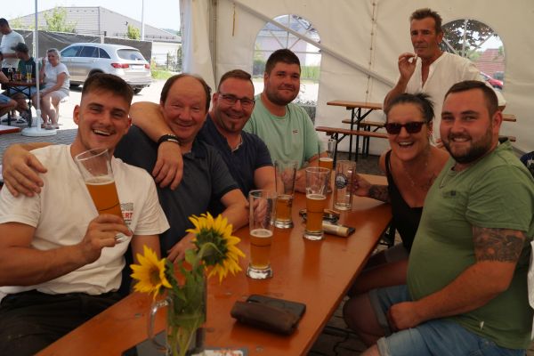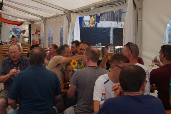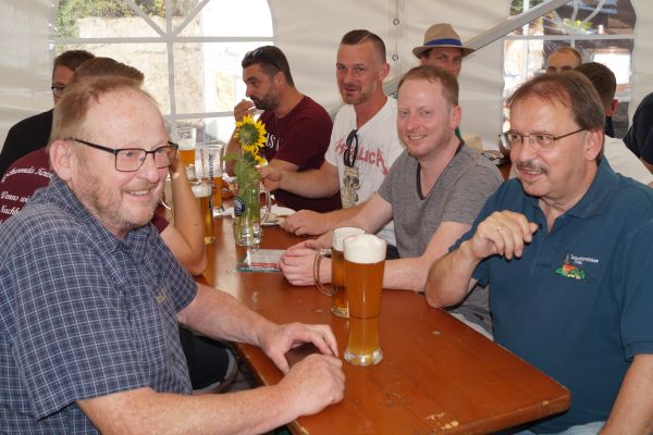 Im Anschluss fanden sich die Geschwander und Lindner Bürger auf dem Bürgerplatz zum traditionellen Frühschoppen mit Weißwürsten und Weißbier ein. Bei strahlendem Sommerwetter um die 30 °C verbrachten die Gäste dort gemütliche Stunden. Für die musikalische Umrahmung sorgte eine von Patrick Grellner zusammengestellte Blaskapelle, die beste Stimmung verbreitete.